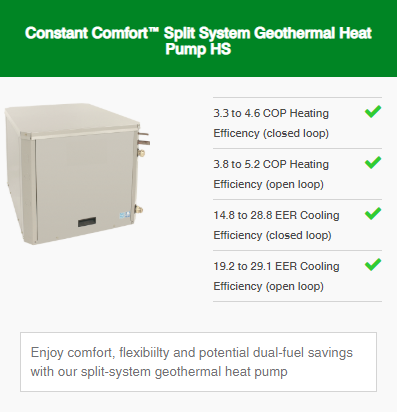 With the heat pump on the outside and a matched indoor unit like a furnace or fan coil, our split system geothermal heat pumps deliver superior efficiency and comfort. When paired with a gas or propane furnace, this system selects the most efficienty heating source for current conditions for even greater savings.